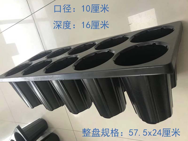 10孔林木育苗穴盘苗木盘,广泛应用于草场、沙漠植树造林,适合林场、林业局树苗木繁育盘的理想选择,树木苗的栽培、育种等,是农艺、种植用栽培盘、栽植盘的必备用品。大孔径育苗穴盘同时可适用于蔬菜、瓜果、苜蓿、玉米、棉花、茄子等的育苗育秧。采用PS材料,无毒环保,透气性能好,大大延长使用寿命。口径:10cm,高深度16厘米。大口径育苗盘的理想选择。林木育苗穴盘采用优质材料PS制造,苗木盘坚固耐用可重复多次使用。一、种子的处理:培育优质穴盘苗,首先应选籽粒饱满、高活力、高发芽率的种子。由于许多厂家出售的是未经消毒的种子,为使种子发芽一致,播种前应进行种子处理。可将种子放入50℃至60℃温水中,顺时针搅拌20至30分钟,在水中浸泡一段时间,漂去瘪粒,用清水冲洗干净,滤去水分。种子风干后备用或进行种子丸粒化。种子丸粒化是用可溶性胶将填充物以及有益于种子萌发的物质粘合在种子表面,使种子表面光滑,大小形状一致,粒径变大,重量增加。需要进行丸粒化处理的种子主要是粒径较细小,不易播种的种子,如四季海棠、矮牵牛、鸡冠花等。