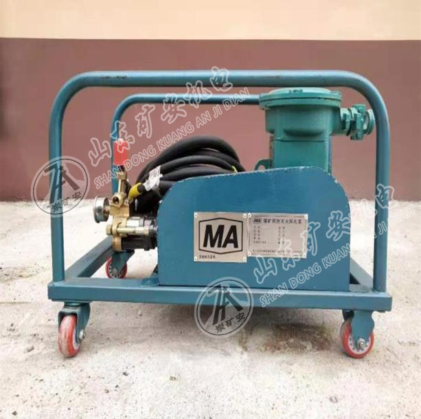山东东达的液压泵由机座、防爆电动机、雾化泵、喷枪等部分组成,液压泵由防爆电机用V带带动液压泵从动轮,以700~800r/min的转速进行工作。液压泵在曲轴转动一转时,分别在三个活塞筒内的三套进水和出水阀组件的作用下进行三次吸液和排液。