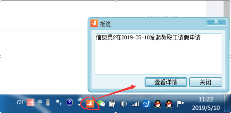 业务系统待办通过APP推送,电脑由下角跳出窗口提醒,点击详细,查看详细进入OA系统审批。