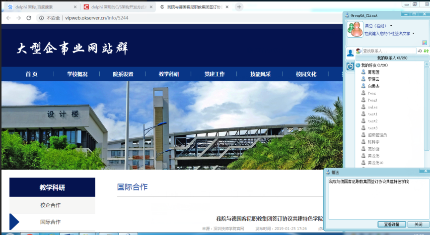 网站群或者OA后台发布,通过APP推送,电脑由下角跳出窗口提醒,点击详细,查看详细内容。
