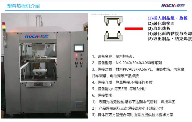 热板焊接机|塑料热熔焊接机|塑料热板焊接机|塑料热熔机|塑料热板机|热板焊接机|热板式熔接机|热板式塑胶焊接机|立式热板焊接机|(刘女士18915321396,13358106655 http://www.nocksonic.com)多头热熔铆点焊接机|热熔铆点螺母埋植焊接机|多头热熔铆点焊接机|立式热板熔接机|中型立式热板机|活性炭罐焊接机|汽车塑料热板焊接机|汽车膨胀水壶焊接机|水箱焊接机热板焊接利用电热熔化原理,准备控制温度变化,配以完善的机械装置来达到完美焊接,弥补超声波焊接机对焊接大型及特殊塑料工件的不足.主要适用于PP、PE等热塑性材料及焊口面积尺寸大而复杂的塑料工件焊接。