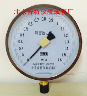 精密压力表生产于北京普特仪表成套厂,北京普特仪表成套厂专业生产精密压力表、耐震压力表、耐震电接点压力表、隔膜压力表、隔膜电接点压力表、精密压力表由测压系统、传动机构、指示装置和外壳组成。精密压力表的测压弹性元件经特殊工艺处理,使精密压力表性能稳定可靠,与高精度的传动机构配套调试后,能确保精确的指示精度。精密压力表主要用来校验工业用普通压力表,精密压力表也可在工艺现场精确的测量对铜合金和合金结构钢等材质无腐蚀性、非结晶、非凝固介质的压力。精密压力表在标度线下设置有镜面环(A型B型),在使用中读数更清晰精确。