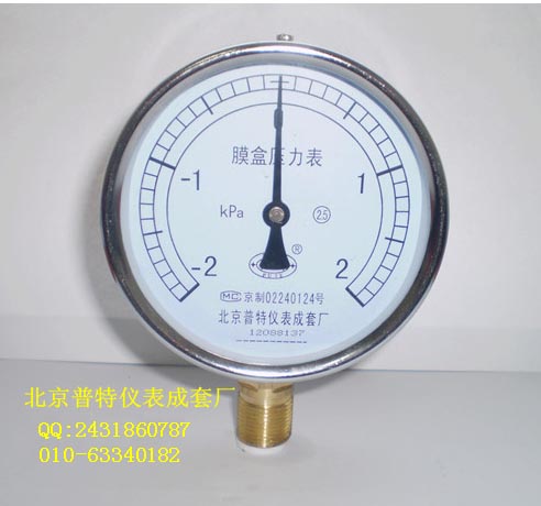 膜盒压力表生产于北京普特仪表成套厂,北京普特仪表成套厂专业生产膜盒压力表、膜盒电接点压力表、隔膜压力表、隔膜电接点压力表、膜盒压力表采用膜盒作为测量微小压力的敏感元件。测量对铜合金不起腐蚀作用、无爆炸危险气体的微压和负压,广泛应用于锅炉通风、气体管道、燃烧装置等其他类似设备上。
