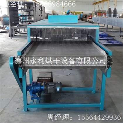 该机为小型带式烘干机,输送带以链板的形式运输,采用不锈钢板3-8冲孔直径之间,适合体积较小的物料。链板为不锈钢304材质,可作为食品输送。