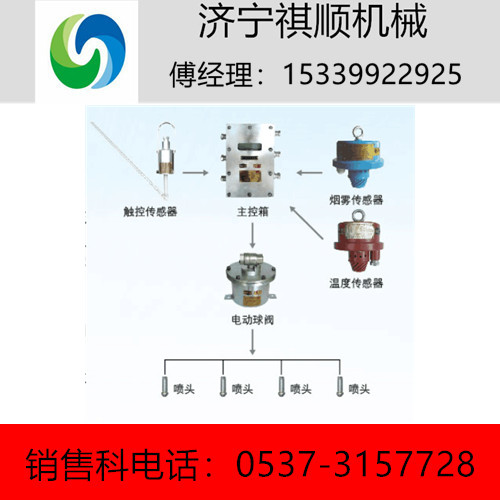 一、主要用于皮带运输巷中皮带机头、机尾及煤流,皮带的降尘、防火;防减速箱、轴承、设备过热引发火患事故。主要设备:主控箱1台、触控传感器1台、烟雾传感器1台、温度传感器1台、电动球阀2台。