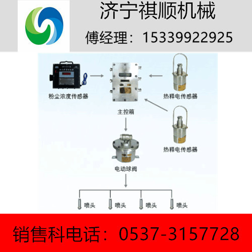 该装置由微电脑程序化自动控制,粉尘浓度低于粉尘浓度传感器设定值时,装置不工作;当粉尘,浓度超过粉尘传感器设定值时,粉尘浓度传感器将信号送入主控箱,主控箱即控制电动球阀开启喷雾酒水降尘。当热释光控传感器探测到过往行人时,将信号传递到主控箱,主控箱即控制电动球阀关闭,停,止喷雾酒水;当人离开酒水区域后,热释光控传感器无信号输出,延时所设定的时间后,电动球阀开启继续喷雾。