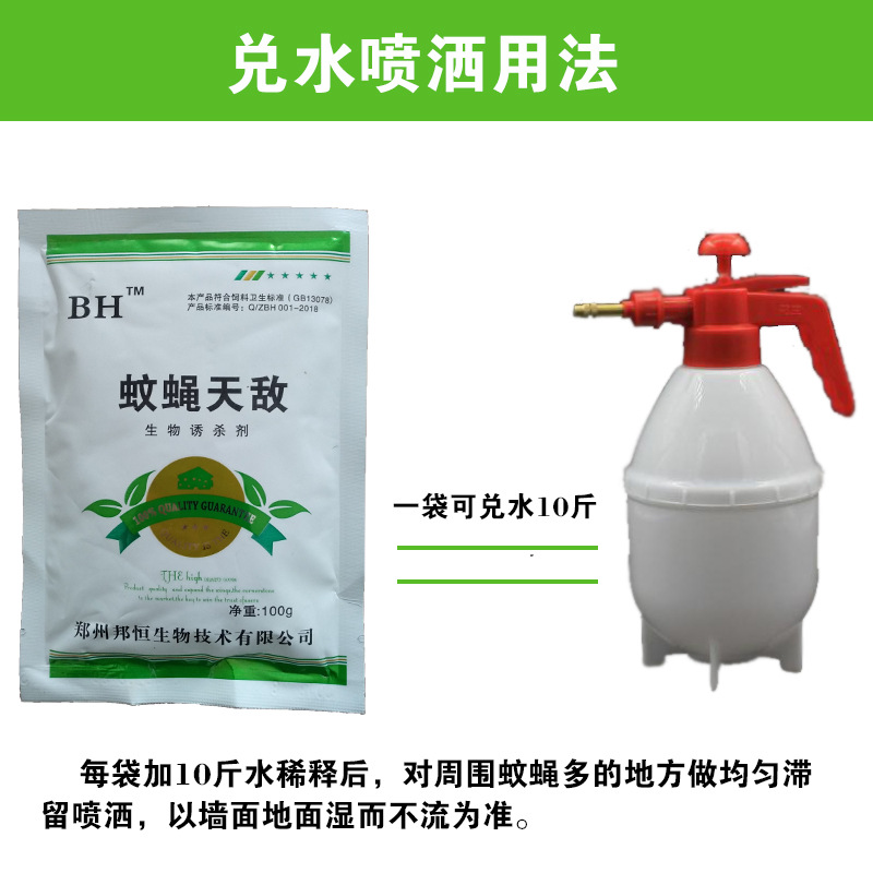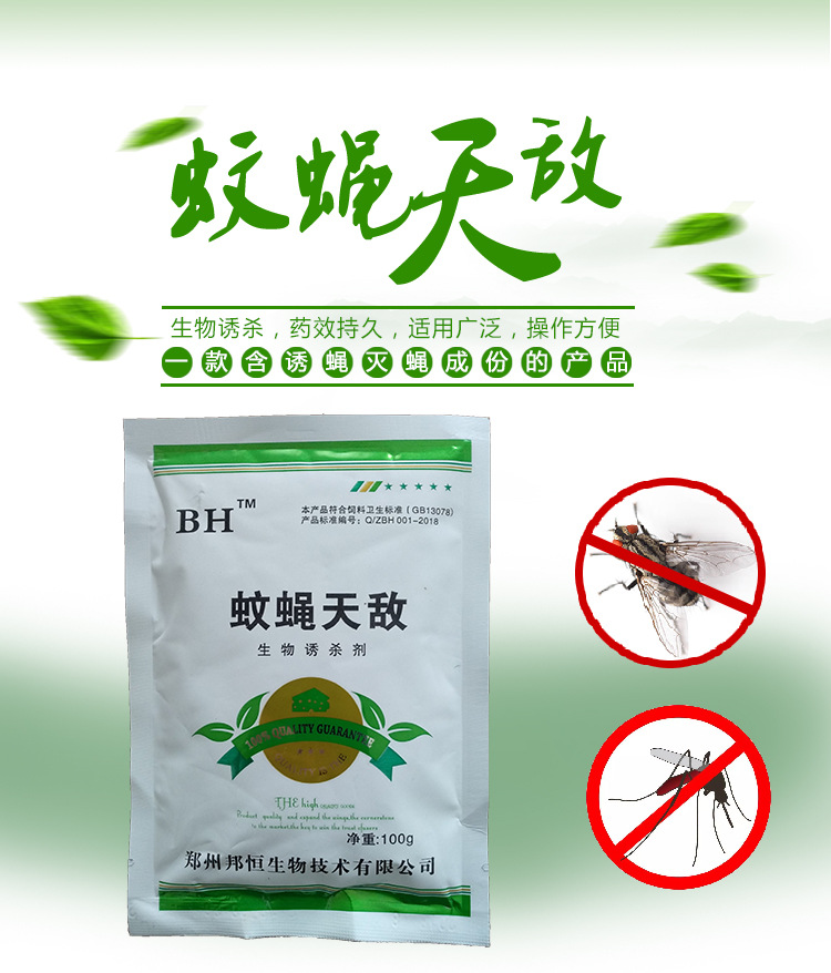 蚊蝇天敌是一款生物诱杀剂,采用世界卫生组织推荐的卫生杀虫剂科学组方而成,具有击倒力强、杀灭速度快、持效期长等特点。蚊蝇天敌为易溶于水粉末,微毒,对人和哺乳动物无害,使用方便,具有触杀和胃毒作用,杀虫谱广,见效迅速,用于防治苍蝇、蚊子等,具有很好的杀灭效果。