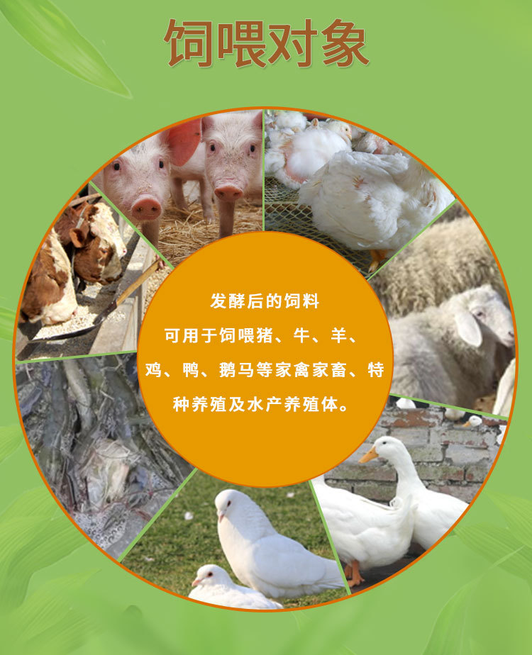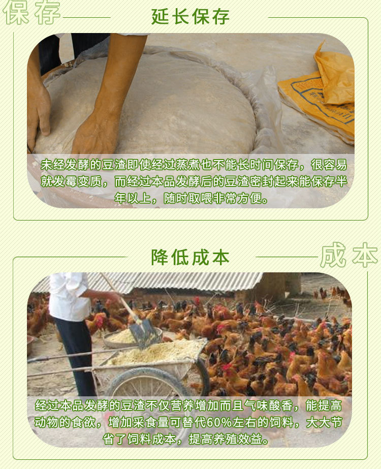 3、提高豆渣消化吸收利用率,发酵的饲料中含有多种有益微生物活菌,建立动物肠道内微生态平衡,动物对饲料中营养成份吸收更完全,因此可降低饲料成本,长期使用能节省10-25%饲料 ;