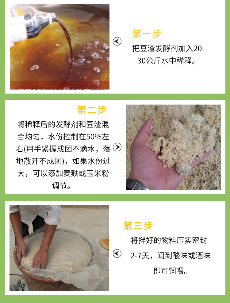 3.发酵后的豆渣饲料,有酒香或醇香气味,动物爱吃,可用来饲喂鸡、鸭、鹅、猪、牛、 羊等禽畜,