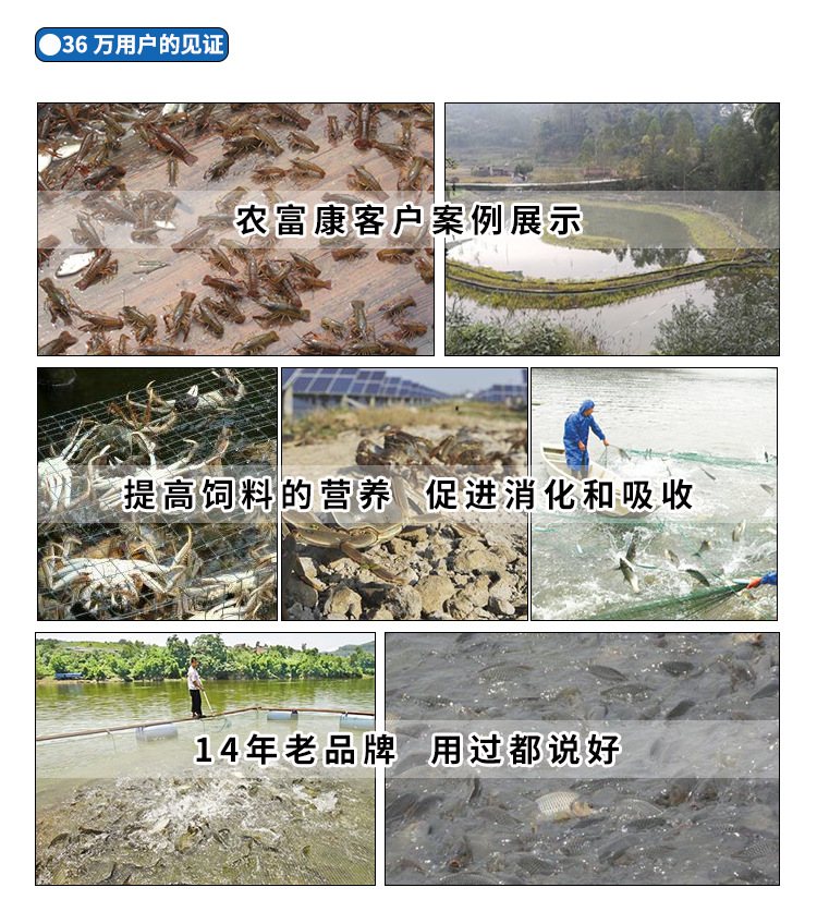 2、发酵肥料肥水、饵料处理:1公斤农富康水产em菌液可以发酵200公斤饲料喂虾,菌液稍兑水拌入发酵料(粪便、豆腐渣、菜籽饼等)密封发酵4-5天,降解粗纤维后,撒塘好吸收,肥水效果好。成品虾料可以按1公斤农富康水产em菌液兑20-30斤水喷湿虾料后投喂,可以促进料的吸收,降低料肉比;小鱼、小虾、螺蛳等活料也可以用菌液喷湿杀菌后喂虾。