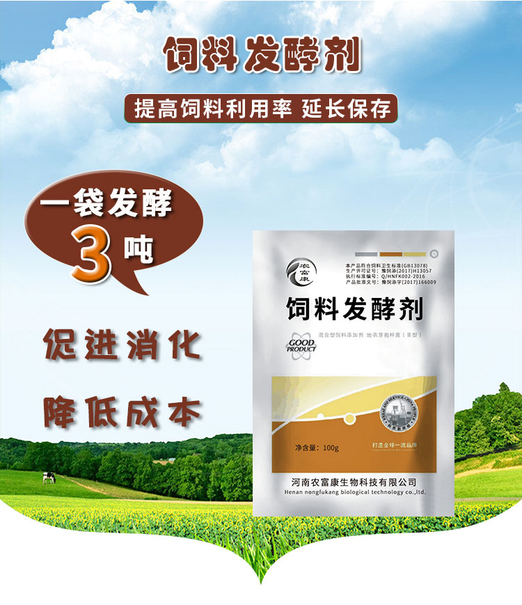 农富康饲料发酵剂的功能作用可以在发酵过程中分泌并合成大量活菌、蛋白质、氨基酸各种生物酶、促生长因子等营养类物质,能调整和提高动物机体各器官功能,提高饲料转化率,对动物产生免疫、营养、生长刺激等多种作用,达到预防疾病、提高成活率、改善适口性、增加采食量、促进生长和繁殖、增肥增重、降低养殖成本、提高养殖效益等.厂家联系方式:134-6025-8890(微-信-同-号)