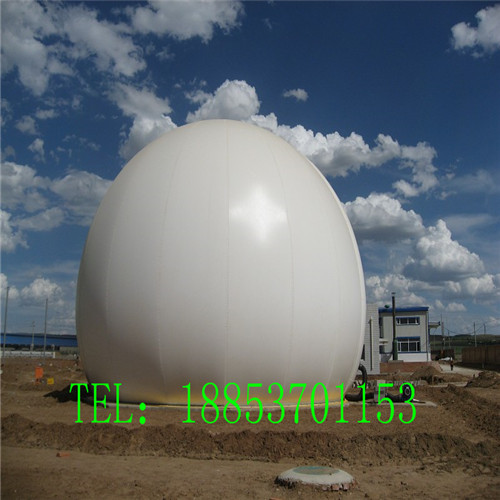 沼气储气柜的外观体验是四分之三个圆球,主体是由特殊的PVC/PVDF聚酯材料加工而成,整个气柜由外膜、内膜、底膜及其他附属设备组成,PVDF聚酯材质有着强烈的抗紫外、抗拉伸、抗腐蚀,外膜与内膜之间通过沼气增压风机提供恒定的沼气存储压力。